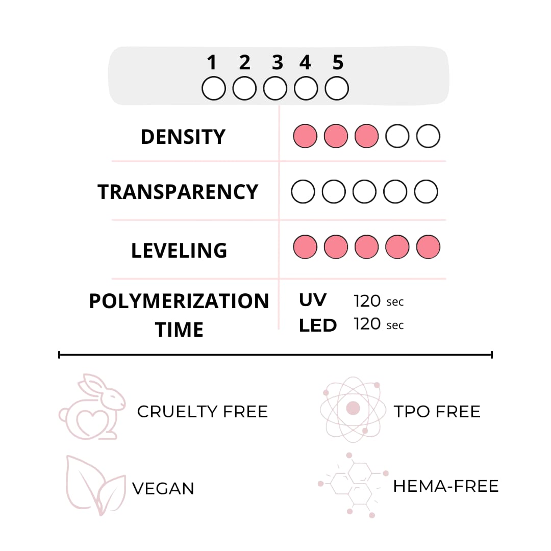 Ingredients (INCI): Urethane Methacrylate, Aliphatic Urethanacrylate, Silica Caprylyl Silylate, PEG-3 Trimethylolpropane Triacrylate, Benzyl Methacrylate, Hydroxypropyl Methacrylate, BHT, p-Hydroxyanisole, Dibenzyl Ether, Polysiloxane, Benzoyl Isopropanol, Ethyl Trimethylbenzoyl Phenylphosphinate, Silica Silylate, Aliphatic Urethane Acrylate Oligomer, Pentaerythrityl Tetraacrylate, Mica, Tin Oxide, CI 77891, CI 60725.